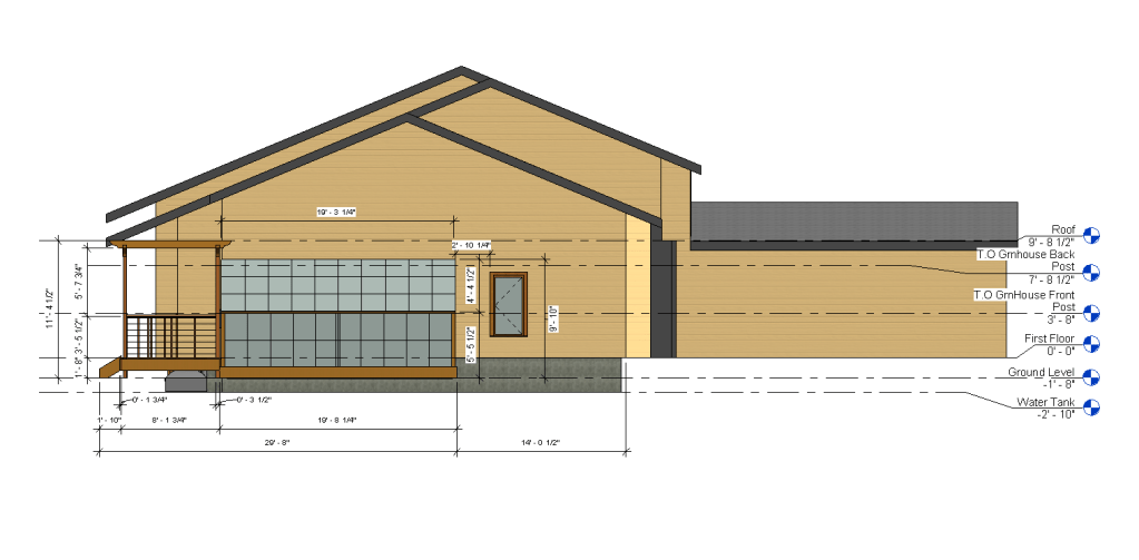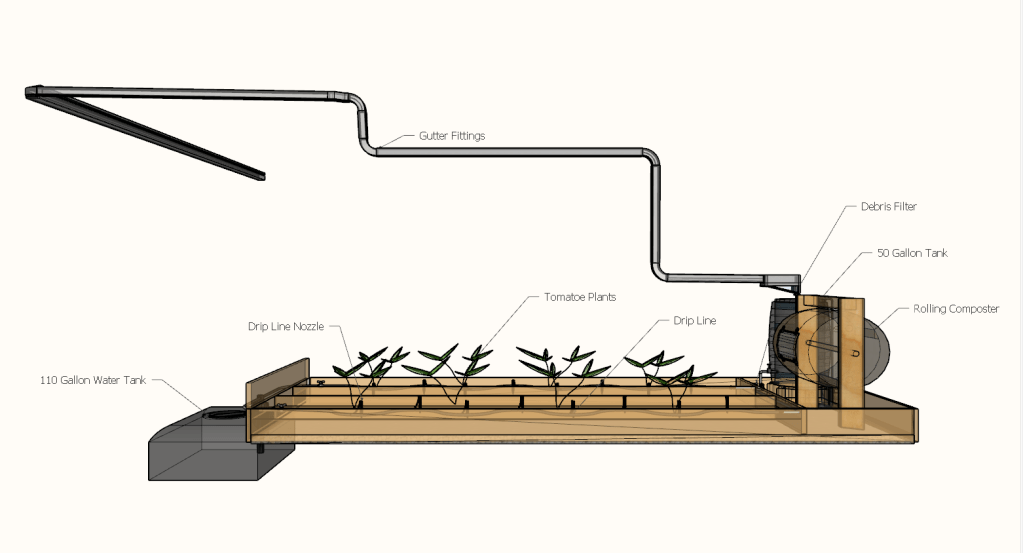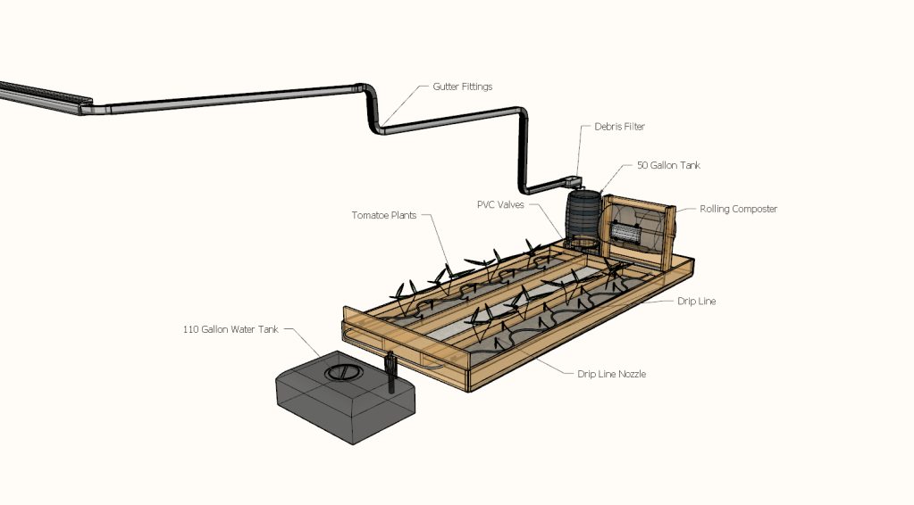 When the release valves on the barrel are open, this gravity fed system allows the water to flow from the storage barrel into the garden beds of the greenhouse. A foul flush valve allows you to divert water out of the system before reaching the barrel, in the case the barrel is full or its the first rain of the year and there is excessive roof debris in the runoff.